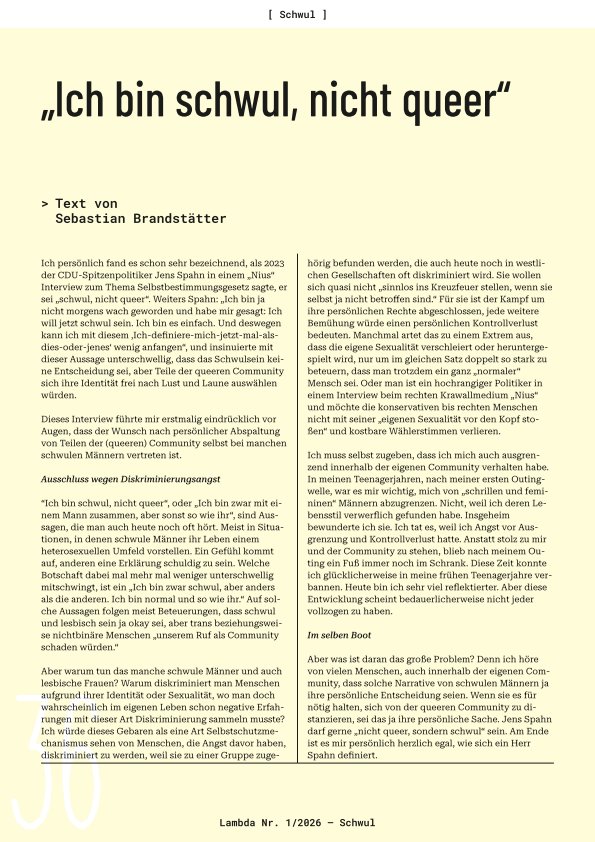 Ich persönlich fand es schon sehr bezeichnend, als 2023 der CDU-Spitzenpolitiker Jens Spahn in einem „Nius“ Interview zum Thema Selbstbestimmungsgesetz sagte, er sei „schwul, nicht queer“. Weiters Spahn: „Ich bin ja nicht morgens wach geworden und habe mir gesagt: Ich will jetzt schwul sein. Ich bin es einfach. Und deswegen kann ich mit diesem ‚Ich-definiere-mich-jetzt-mal-als-dies-oder-jenes‘ wenig anfangen“, und insinuierte mit dieser Aussage unterschwellig, dass das Schwulsein keine Entscheidung sei, aber Teile der queeren Community sich ihre Identität frei nach Lust und Laune auswählen würden.